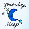 Description: words in cursive "prioritize sleep" above and below an ink drawing of a crescent moon with three stars around it.
