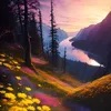 Description: woman in a green dress and cloak holding a rose, looking up at snow falling down on her